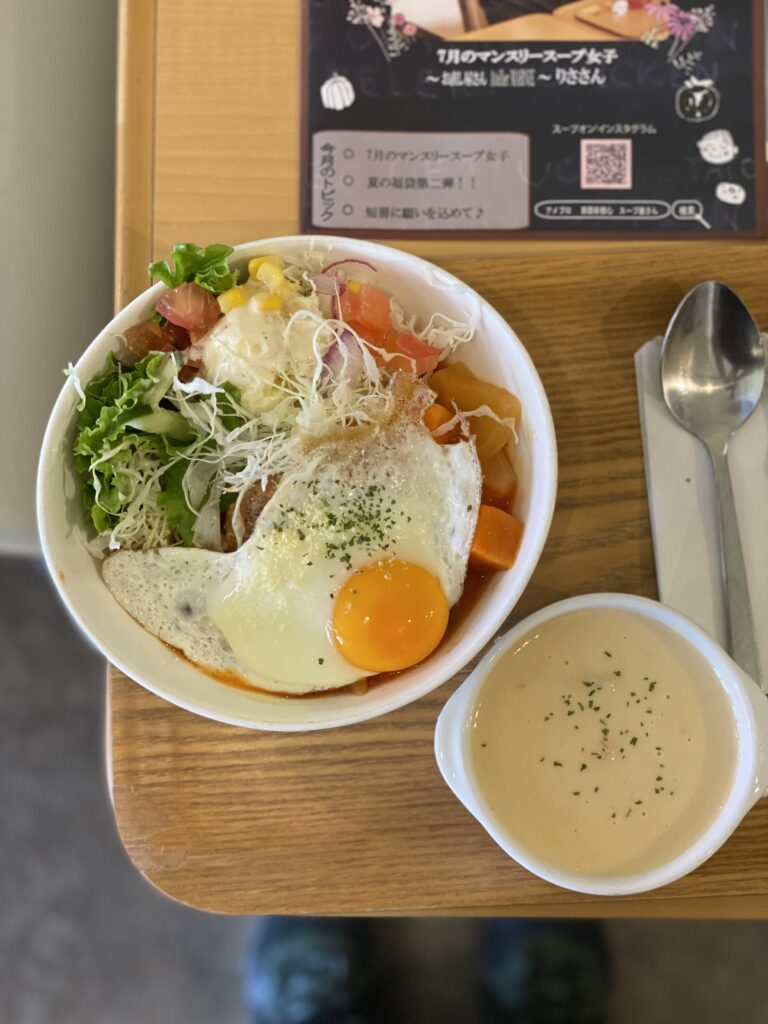 真ん中の席に着き、3つほどおすすめされた中の、今回は「ロコボゥル、ライスボォル」set +チーズフォンスープ(¥1260)を
