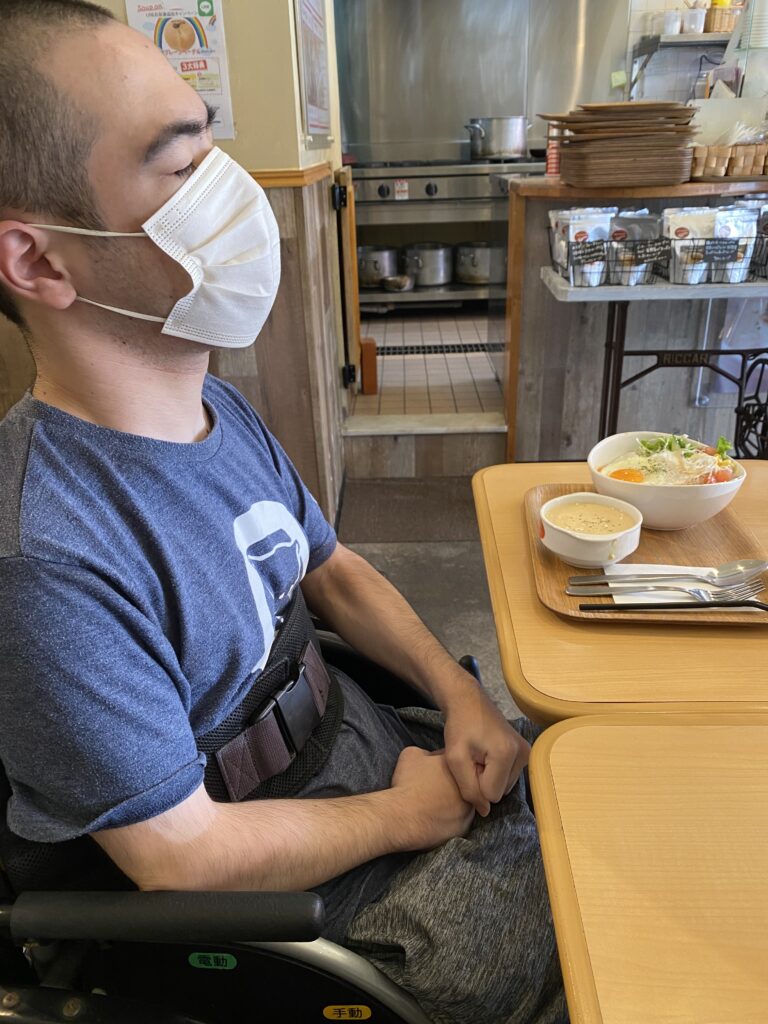 自力で食事をしようと試みたものの、テーブルの足が車椅子にあたり食べにくかったので、ヘルパーさんに介助をお願いしました!(※足元の写真を撮り忘れました。すみません…)